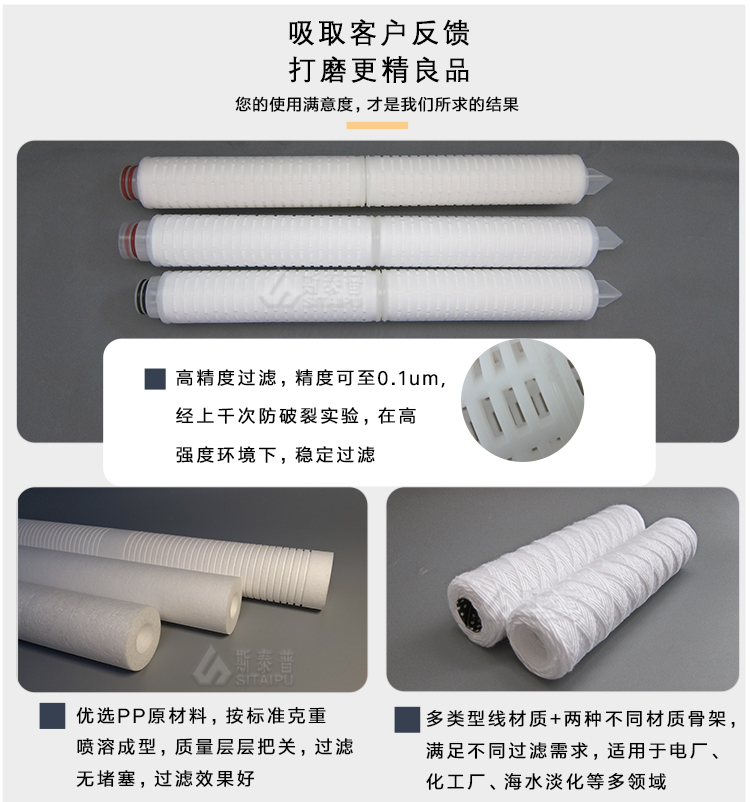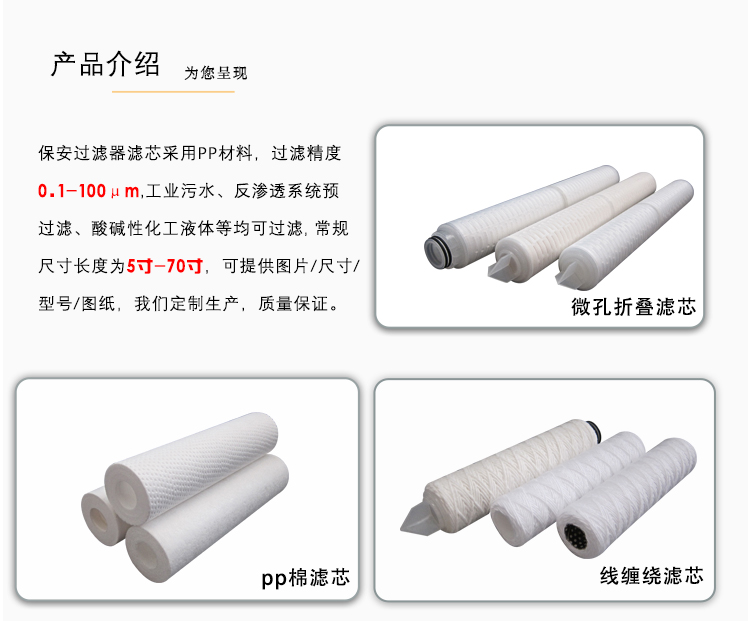 产品简介:中水处理器保安过滤器滤芯采用五层折叠式结构,具有高强度聚丙烯支撑骨架,其折叠结构使其比普通滤芯具有更大的过滤面积,因此在应用中流量大,过滤寿命长,更换次数小,具体产品可分为pall颇尔水滤芯、3M水滤芯、parker派克水滤芯、折叠滤芯、喷溶滤芯、线绕滤芯